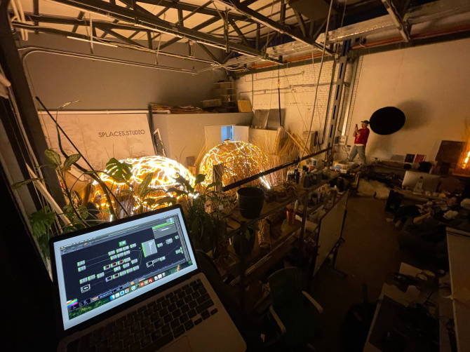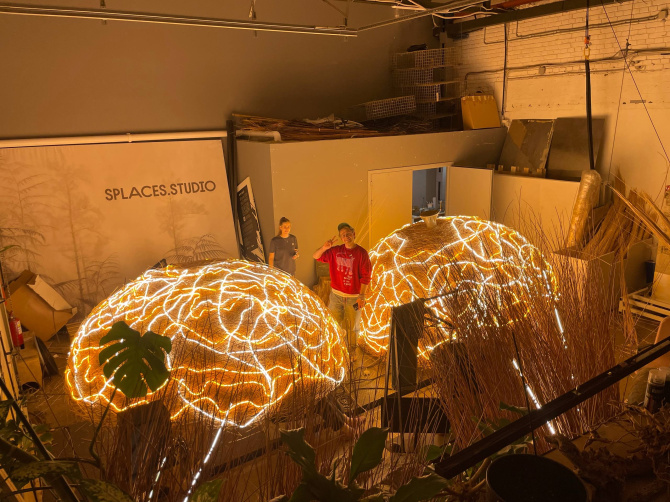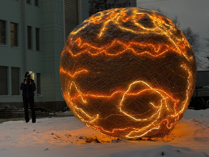 «Изготовлен шар таким способом, каким обычно птицы мастерят свои гнёзда. Такое плетёное гигантское гнездо в виде шара. Мы в него вставили огромное количество светодиодов. Их около 150, это светодиодные линии, которые работают от компьютера с большим количеством датчиков», — рассказывает Андрей Шибанов.