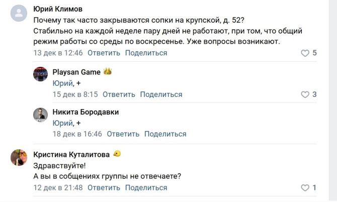 Однако из комментариев подписчиков понятно, что практические все площадки, направленные на развитие массового спорта, работают с перебоями. В декабре закрывались так же – без объяснения причин – «Сопки» на Крупской, 52, в ноябре – на Кильдинской, 9 и ул. Баумана, 42…