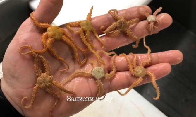 Речь идёт об офиурах или змеехвостках — таких донных морских животных поймал в сети Роман Федорцов. Иглокожих блогер снял на видео и опубликовал в своих соцсетях.
