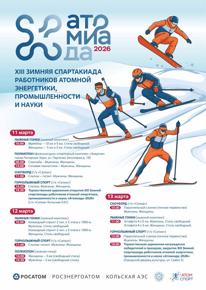 С 11 по 13 марта в городе-спутнике Полярные Зори пройдёт XIII Зимняя спартакиада работников атомной энергетики, промышленности и науки «Атомиада — 2026»*. 16 команд и более 240 спортсменов из различных дивизионов Госкорпорации «Росатом» померятся силами в четырёх дисциплинах: полиатлон, лыжные гонки, сноуборд и горные лыжи.