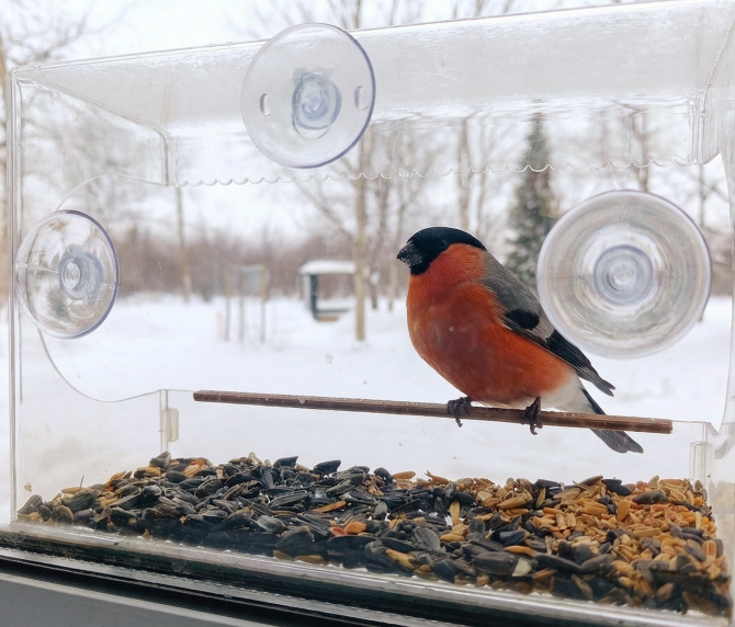 «В прозрачную кормушку прилетают синицы, воробьи, снегири. А недавно заглянула очень бойкая и деловитая чечётка: разогнала всех остальных «постояльцев» и тщательно выбирала самые вкусные семечки», — написали в соцсетях сотрудники ботанического сада.