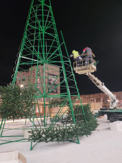 В Оленегорске в сквере «Надежда» приступили к монтажу новогодней елки.