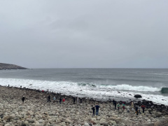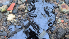 Камни в вязких пятнах, а в воде – черные капли. Это берег Кольского залива в жилом районе Росляк…